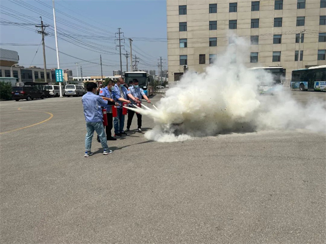 會后,在公司院內(nèi)進行實地演練,模擬公交車輛突發(fā)火災時,駕駛員在應急情況下緊急停車,疏散乘客,正確使用滅火器進行滅火等內(nèi)容。