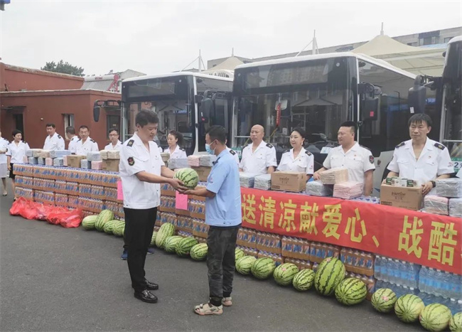 7月28日,沈北公司開展了“‘戰(zhàn)酷暑 保安全’送清涼獻愛心活動”。公司工會為職工們精心準備了“夏日清涼包”、西瓜、大量的礦泉水,公司負責人將“清涼”親自送到職工手中,同時叮囑車隊長合理安排工作,注意防暑降溫,確保職工身體健康。