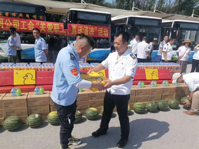 7月26日是二伏的第一天,酷暑難當。黃河公司由工會牽頭、領(lǐng)導班子帶隊,在西江街公交樞紐站開展了“關(guān)愛職工、夏送清涼”活動?;顒又?,公司領(lǐng)導班子將購置的飲料、礦泉水、浴巾、毛巾、西瓜、洗手液等防暑降溫及清潔物品,分發(fā)給公司公司所屬14個車隊的22條線路、及機關(guān)、車間。