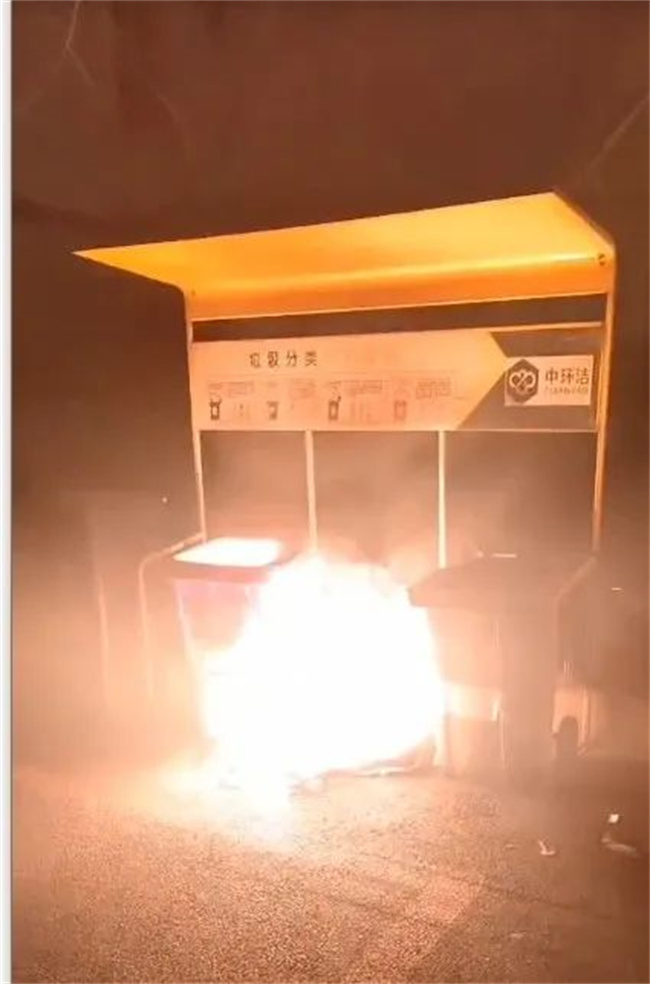 李輝立即跑出站務(wù)室,發(fā)現(xiàn)馬路對面的垃圾分類站中的垃圾桶正在燃燒,眼看火焰越燒越旺,李輝立即叫上夜勤人員穆懷東一同上前滅火。