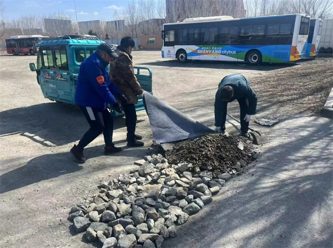3月15日,154路車隊管理人員及駕駛員利用午間休息時間對場區(qū)大門處破損路面進行修繕、回填,并重新鋪設。經過大家的努力,塌陷路面修繕完畢,路面恢復平整,方便了公交車輛和行人通行,收獲好評。
