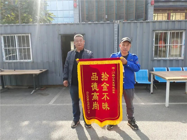 10月7日,一名乘客帶著寫有“拾金不昧 品德高尚”的錦旗來到211.222路車隊(duì),以此表達(dá)對(duì)駕駛員彭軍的感激之情。