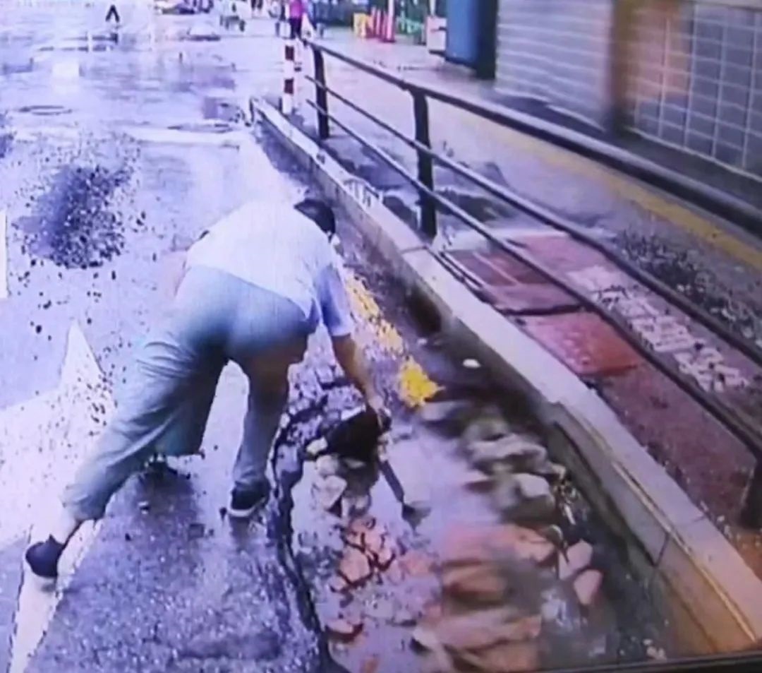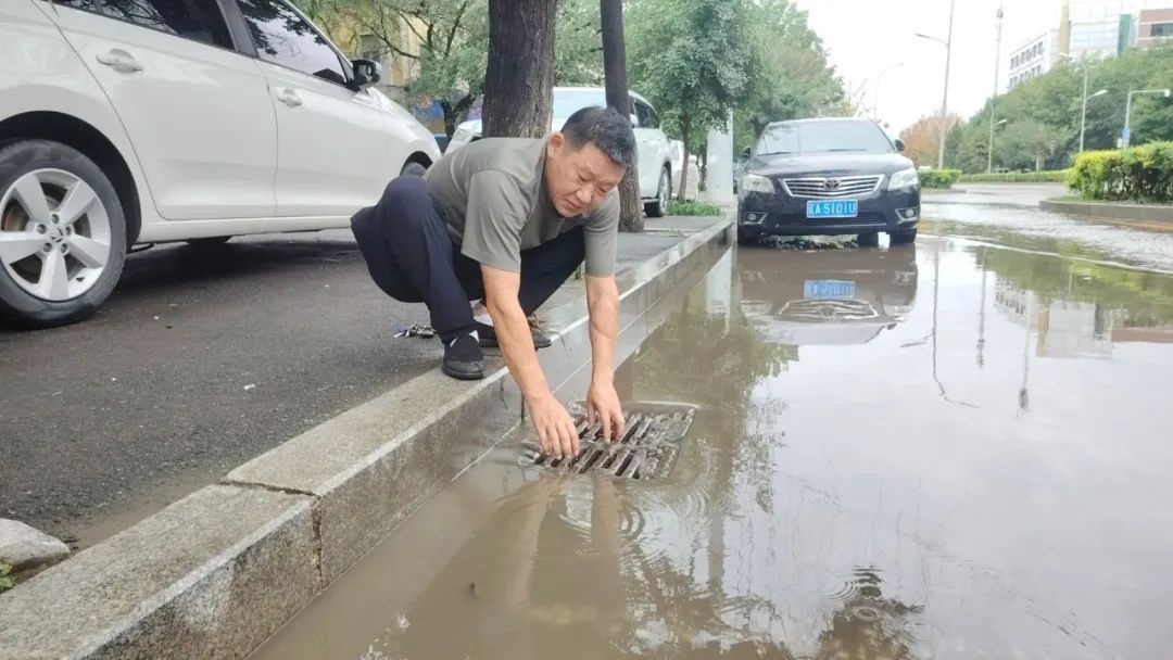 下了幾乎一夜的雨將254路車隊(duì)門前道路幾乎淹沒,254路車隊(duì)長劉佳寧拿起鐵鍬等工具,對下水道附近的污垢進(jìn)行清理,排除積水。