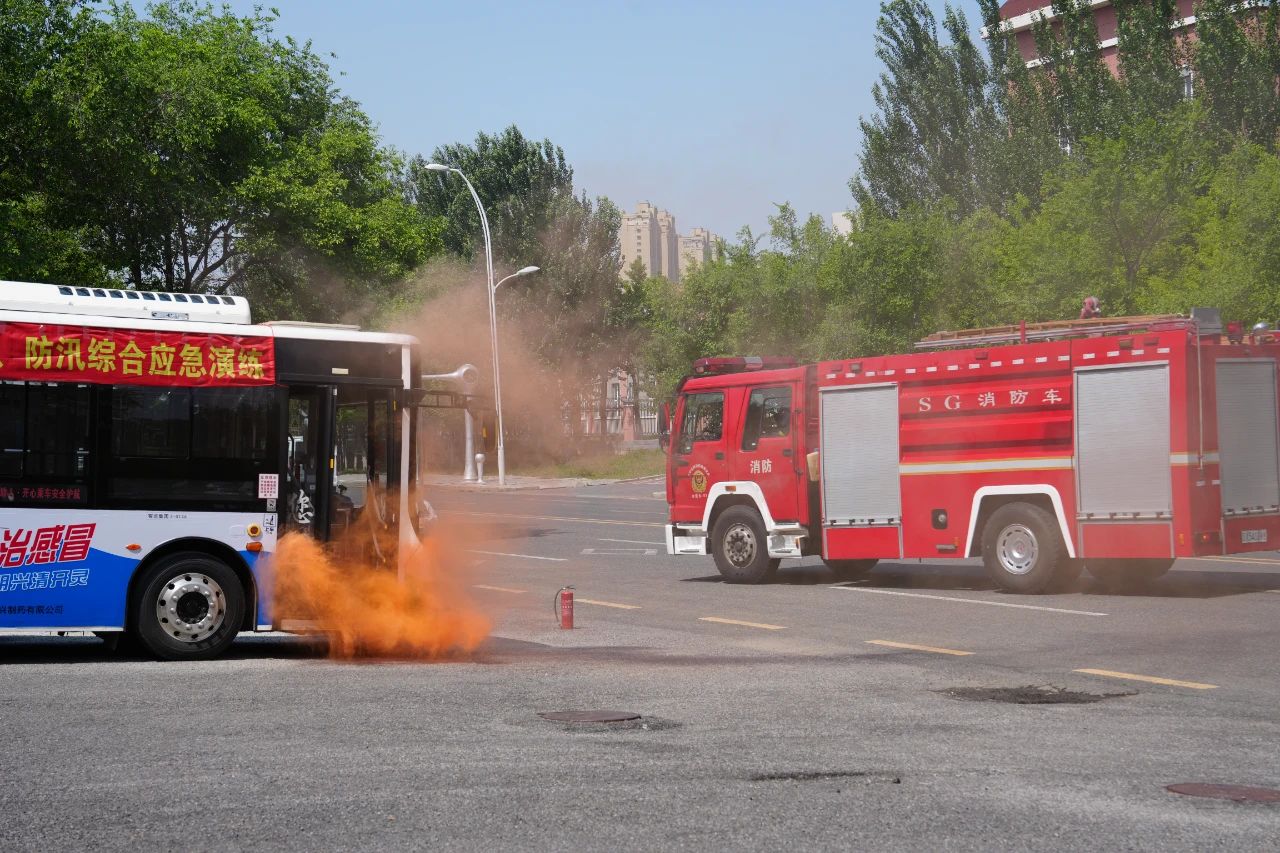 演練模擬了公交運營中多種突發(fā)場景,包括車輛火災(zāi)撲救、乘客攜帶危險品處置、積水路段熄火應(yīng)對以及車輛遇險(進水、被困)時緊急停車、使用滅火器/安全錘破窗、疏散逃生等。