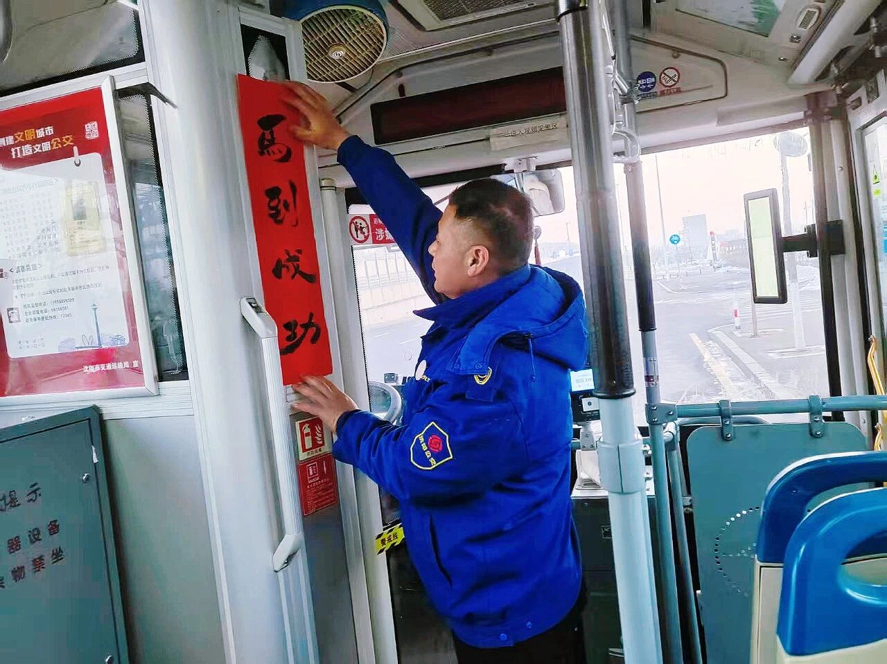 各車隊(duì)還在車廂內(nèi)懸掛紅燈籠、窗花等傳統(tǒng)裝飾。特別是271路駕駛員、書畫愛好者唐德忠揮毫?xí)鴮憽案!弊峙c春聯(lián),筆墨飄香之間,車廂內(nèi)外洋溢著濃濃年味,也傳遞著公交人對乘客真摯的新春祝福。