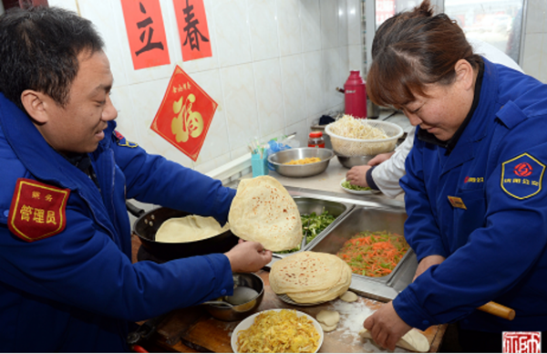 “哎呦,今天烙春餅啦!難怪老遠(yuǎn)兒就聞見(jiàn)了香味兒??欤o我先來(lái)兩張!”2月3日大年初七,是節(jié)后的第一個(gè)工作日,恰逢立春。11時(shí)左右,211路駕駛員張智剛跑完一圈兒回到大北門(mén)終點(diǎn)站,就被食堂的飯香吸引過(guò)去。