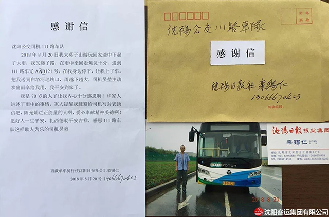 8月20日下午,沈陽(yáng)突降大雨,鑫暢巴士v111路駕駛員吳堃駕駛公交車駛至莫子山公園附近時(shí),看到一位老人在路邊徘徊,全身已被雨水澆透。雖然老人沒有在站點(diǎn)位置等車,但吳堃見老人狀態(tài)不佳,于是將車??吭诼愤?。走近后見老人臉色慘白,嘴唇已經(jīng)沒了血色,便關(guān)切地詢問道,老人稱自己迷了路,找不到回家的方向了。于是吳堃第一時(shí)間將老人帶回了車隊(duì),找來干毛巾把老人身上的雨水擦干,喝了熱水后老人逐漸緩了過來。原來,老人姓欒,家住五愛街,到莫子山公園游玩,突然下起了雨,他趕緊往山下跑,卻因新修路不熟悉路形而迷失了方向。