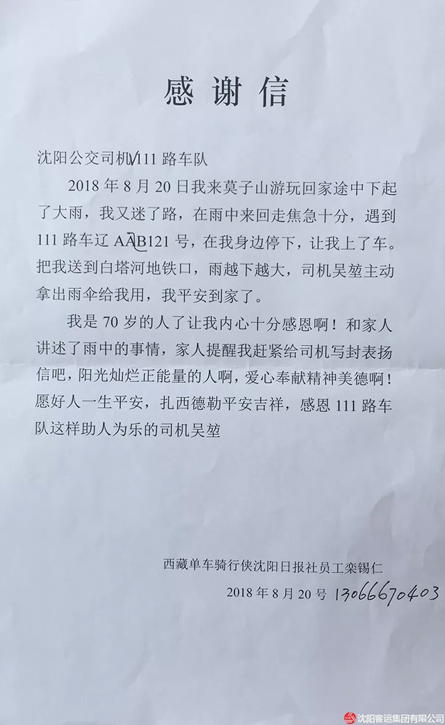 27日一大早,老人來到了鑫暢公司V111車隊(duì),送來了一封感謝信!見到吳坤第一句話就說:“太感謝你了小伙子,如果你那天沒看見我,不送我坐地鐵回家,我今天一定不會(huì)安好的站在這里…”說著老人流出了感激的淚水。