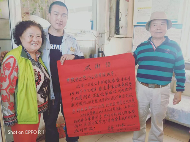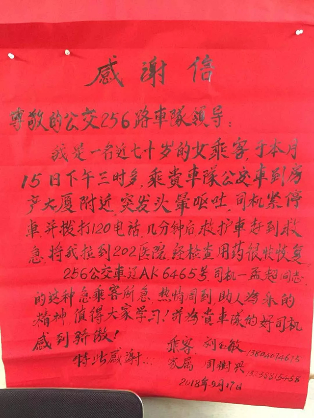 兩天后,老人攜同老伴,將一封寫(xiě)滿真情的感謝信送到了通利公司256車隊(duì)。老人說(shuō):“當(dāng)天舊疾復(fù)發(fā),非常危急,萬(wàn)幸救護(hù)及時(shí)才沒(méi)有釀成悲劇。”據(jù)悉,在經(jīng)過(guò)短暫治療后,老人不顧阻攔,堅(jiān)持要親自來(lái)到公交車隊(duì)對(duì)孟超同志表達(dá)感謝,并請(qǐng)求車隊(duì)領(lǐng)導(dǎo)對(duì)孟超這種救死扶傷的高尚品德提出鼓勵(lì)與表?yè)P(yáng)。老人在站務(wù)室等待了近兩個(gè)小時(shí),才將這份真誠(chéng)的謝意親自交到了駕駛員孟超的手上。