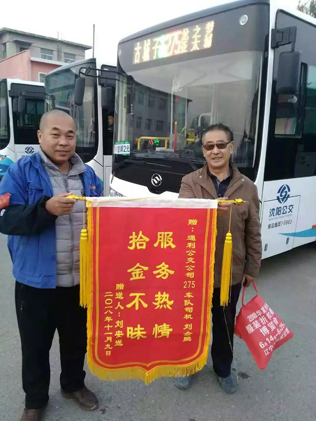 乘客劉先生隨后也到了龍之夢拿到了失而復(fù)得的巨額票據(jù),卻沒能見到駕駛員劉金鵬。幾日后乘客劉先生來到了龍之夢終點站為駕駛員劉金鵬送上了一面錦旗,稱贊275路車隊駕駛員拾金不昧,高尚品德,心系乘客…